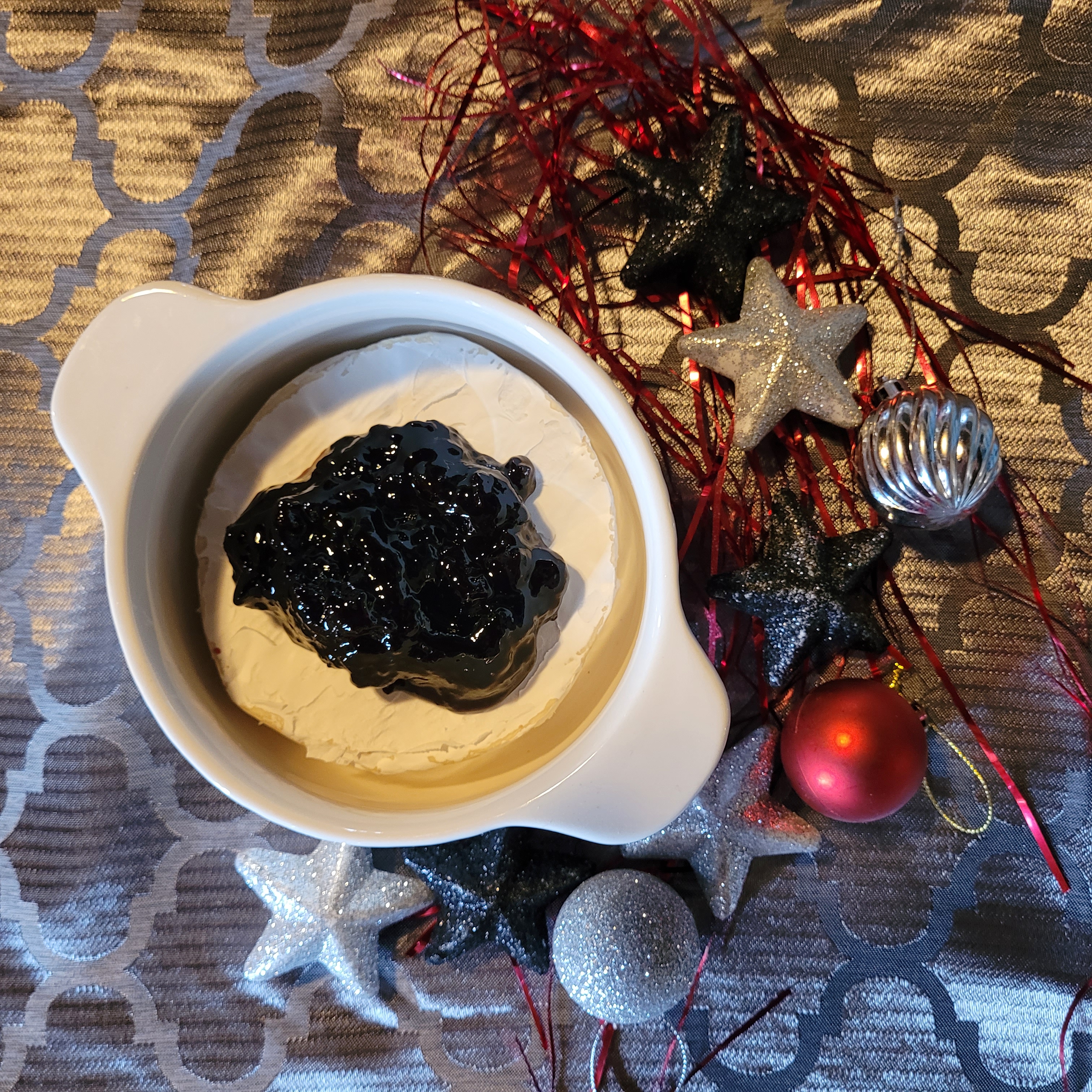 - Spread blackcurrant jam evenly over the top of the Brie. Optional: Sprinkle with chopped nuts